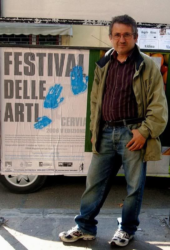 Enzo Correnti con il manifesto del Festival delle arti Cervia (Ravenna)